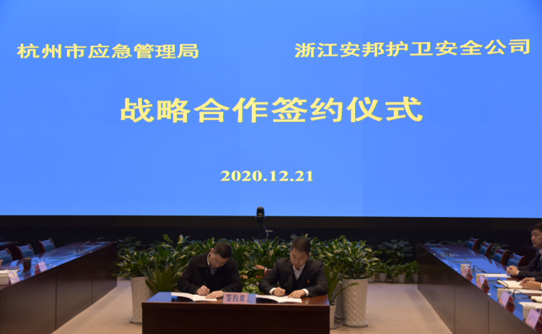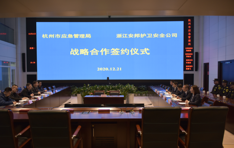 12月21日上午,浙江安邦护卫安全服务有限公司与杭州市应急管理局举行战略合作签约仪式。杭州市应急管理局党委委员、巡视员陈鹏飞,浙江安邦护卫安全服务有限公司董事长黄云出席签约仪式,并分别代表双方签署战略合作协议。根据协议,双方将在资源共享、队伍建设、应急装备及实训场地建设、信息化建设、联合开展应急演练、建立统一指挥调度机制、参与基层应急管理、加强应急值守协作等八个方面开展深入合作。仪式由杭州市应急管理局应急救援指挥中心主任杜建定主持。