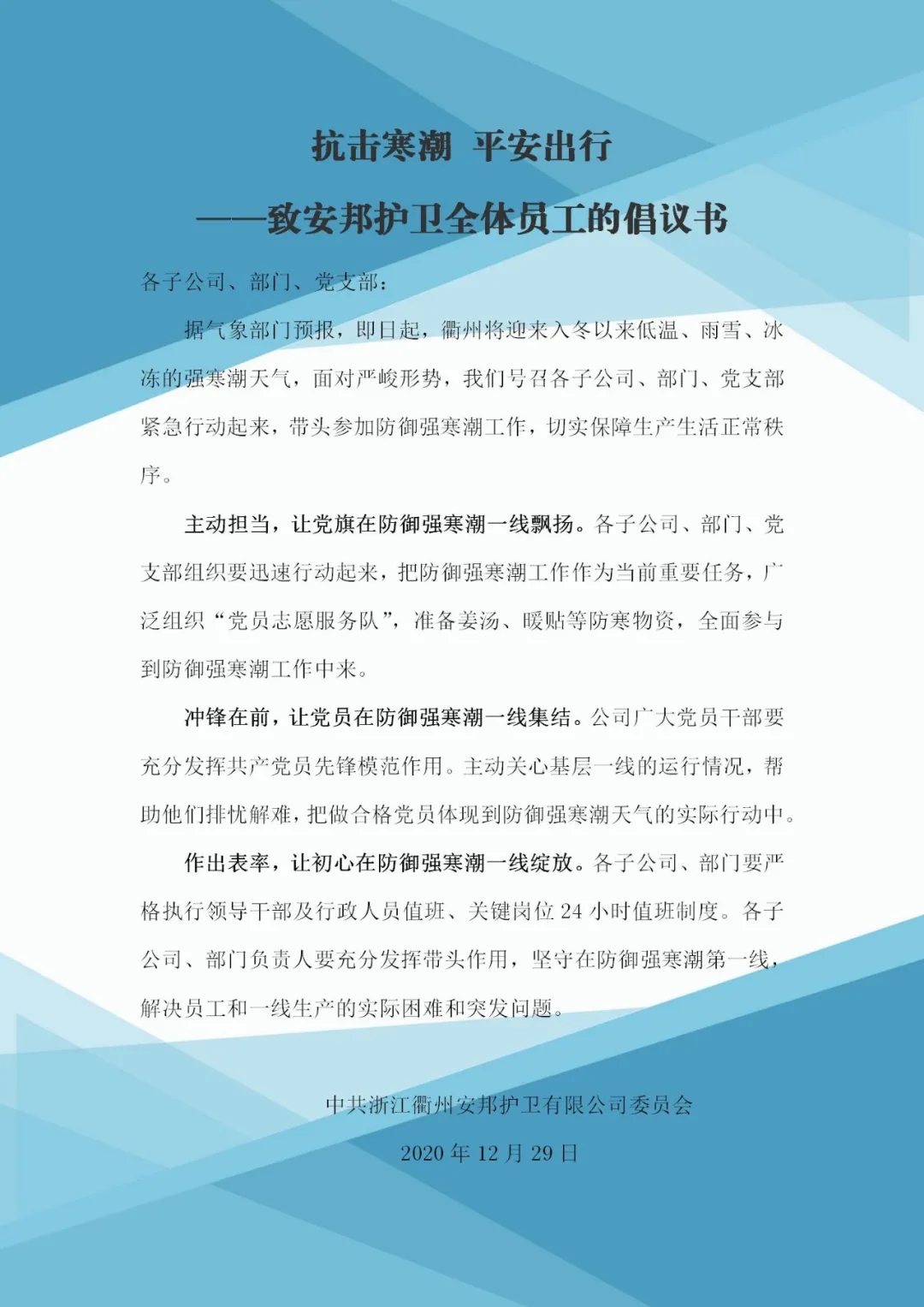 浙江衢州安邦保安服务有限公司先后召开行政人员雨雪寒潮天气应对工作会议、各大队队员防范应对大范围寒潮天气会议,要求思想上要高度重视,引起足够警惕,研判极端天气对安全工作、疫情防控工作带来的影响及可能诱发的灾害。特别是安全用电用火,强化队员安全取暖意识。