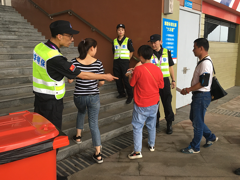 根据安排,公司主要负责场馆东区预检口、看台及二层环道等区域的安保任务,负责引导观众有序入场、出场,维护看台秩序,防止观众站立观看、跨区观看、占据通道观看等。