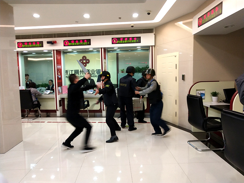 演练现场真实还原我方队员在与行方交接款时突遇持刀歹徒抢劫,双方共同制服歹徒的场景。演练过程中,双方人员迅速反应,沉着应对,严格按照应急方案进行处置,成功将歹徒制服,圆满完成了此次联合防抢应急演练,达到了预期效果。