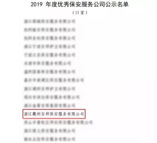 浙江衢州安邦保安服务有限公司被浙江省保安协会评为“2019年度优秀保安服务公司”。
