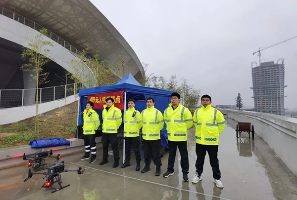 体育中心面积大、空间开阔,观众集中,为了在突发事件发生时第一时间将现场图像传回指挥中心,安邦无人机技术团队在外场区域设立了一个保障点、两支飞行小队。