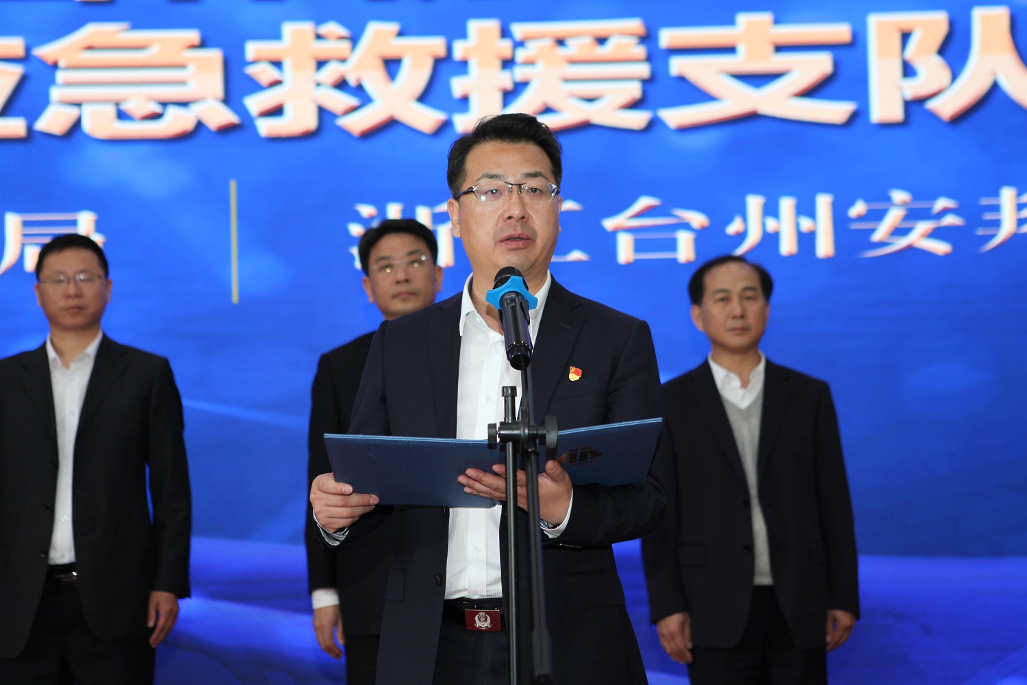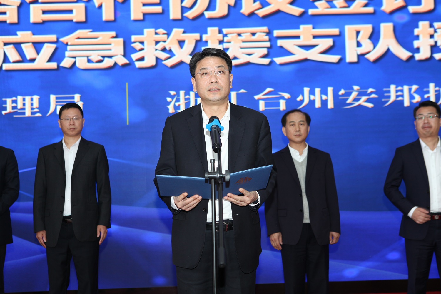 台州市应急管理局党委书记、局长李斌为台州安邦护卫应急救援支队授旗并讲话。