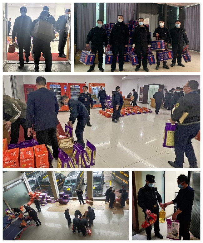 发放现场,有的人在分箱搬运,有的人在登记发放,大家肩抗手提,你来我往,场面非常热闹,上下洋溢着一片和谐温暖的喜庆氛围。