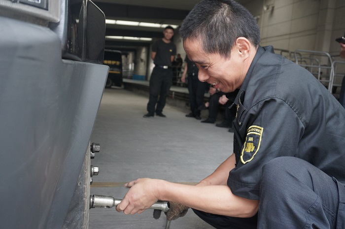 为全面强化巩固守押人员的职业技能、操作规范和应急能力,贯彻推行守押工作规范化、标准化,确保在十九大期间的守押工作安全有序, 8月19日、9月2日两天,公司举行2017年岗位练兵考核。全体直属守押大队、县市守押大队驾驶员及持枪押运员参加考核,依次进行驾驶员更换轮胎、押运员枪支分解结合、运钞车过单边桥三个项目的考核。参考队员充分发挥日常守押工作和定期岗位练兵养成的娴熟技术和专业素养,展现了安邦员工扎实的岗位技能、一流的综合素质和高超的业务水平,为确保十九大期间公司守押工作安全、有序运行作出了优秀示范。