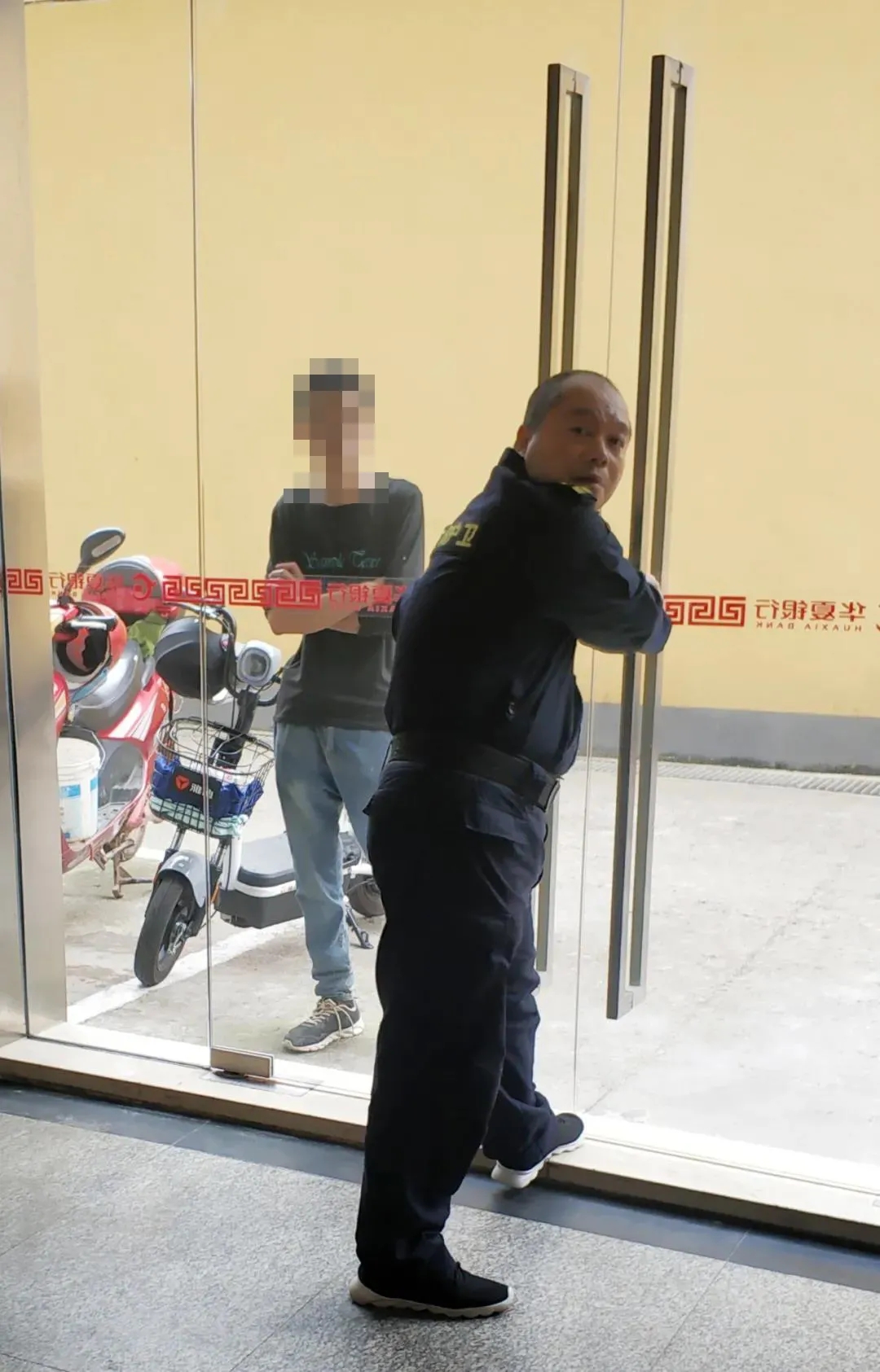 华夏银行员工在营业厅后门发现有持刀可疑人员,保安员陈勇接到通知后,立刻赶到现场,可疑人员见势从身后抽出携带刀具。见状,陈勇立即喝止并大跨步上前,贴身阻止,将可疑人员拖离至后门外,整个擒拿过程也就五六秒时间。保安大队长汪伟锁上后门,另一保安队员姜剑立刻拨打110电话,5分钟后6名公安特警到达现场进行处理。