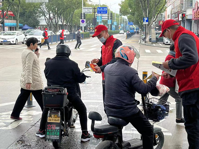 志愿者们走入社区及街头,现场向行人派发宣传单张,提醒骑乘电动自行车的民众要正确佩戴安全头盔,不闯红灯、不过线、不带人;宣讲交通违法行为危害性,引导人们正确认识交通安全,践行交通安全,文明守法、平安回家。