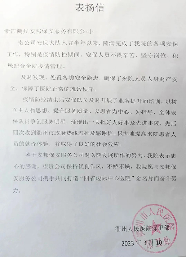3月10日,衢州安邦保安公司收获一份来自衢州市人民医院保卫处对公司共建平安就医环境的肯定。信中说道,该中队入驻医院以来,圆满完成各项安保工作。尤其在疫情期间,积极配合疫情管理,发现及处置各类安全隐患,保障来院人员人身财产安全和医院就诊秩序。积极开展业务提升培训,争创服务明星,涌现出一大批好人好事,提高来院人员就诊体验,取得良好社会效应。先后四次收到市政府热线表扬及感谢信。
