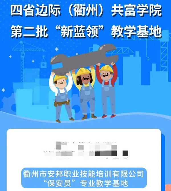 为扎实有序推进“新蓝领、新农人、新工匠”扩中提低工作,全面助力四省边际(衢州)共富学院建设工作取得突破性进展,8月9日,衢州市人力社保局公布,决定授予衢州中等专业学校等10家单位为第二批“新蓝领”教学基地,衢州市早椿堂农业有限公司等10家单位为第二批“新农人”教学基地。其中衢州市安邦职业技能培训学校有限公司被授予四省边际(衢州)共富学院第二批“新蓝领”教学基地:“保安员”专业教学基地。