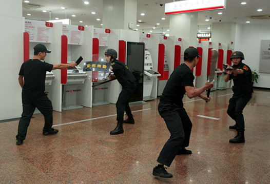 演练地点设置在中国工商银行嘉善支行营业部内,安邦护卫小队模拟在网点执行ATM加钞业务时遇持刀歹徒抢劫的情景进行应急处置。押运员、交接员在网点内按规程进行对接后,两名交接员在二名押运员护卫下,持款箱行往ATM加钞间准备执行任务,此时2名持械(一人持砍刀,一人持菜刀)歹徒突然闯入网点袭击小队,试图抢劫款箱。
