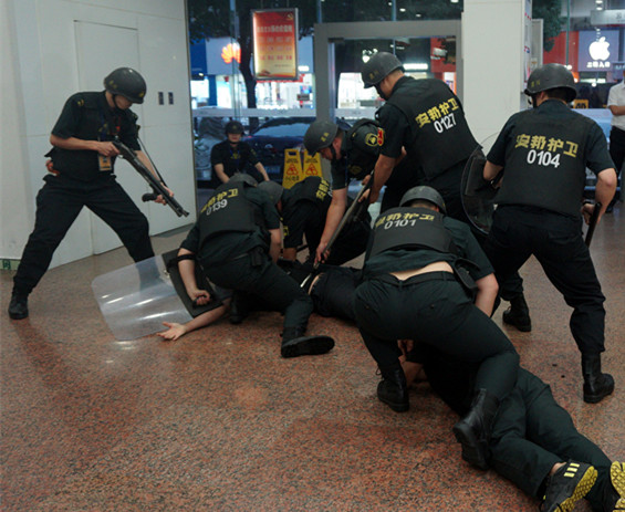 安邦护卫应急小分队接警到达现场后,歹徒见势准备逃跑,两队展开了合围,最终将犯罪嫌疑人制服。