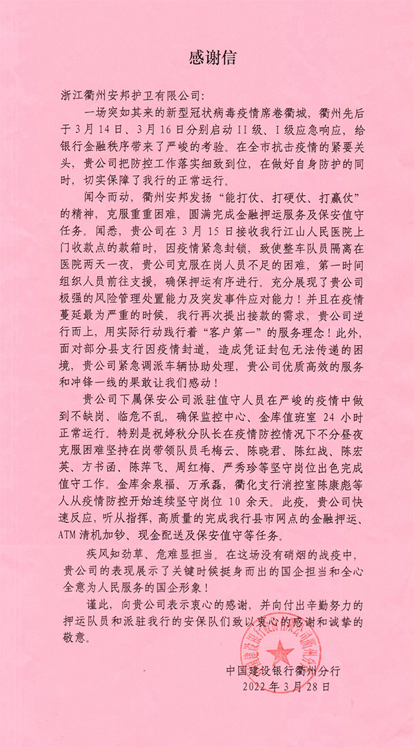 3月28日,浙江衢州安邦护卫有限公司收到一封建设银行衢州分行发来的感谢信。对公司快速反应、听从指挥,高质量完成行方县市网点的金融押运、ATM清机加钞、现金配送及保安值守等任务表示衷心的感谢,并向付出辛勤努力的押运队员和派驻行方的安保队员致以诚挚的敬意。字里行间充满了战“疫”守望相助之情,展现了衢州安邦公司“关键时刻挺身而出”的国企担当和全心全意为人民服务的国企形象。
