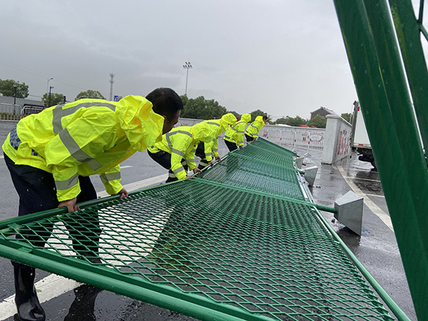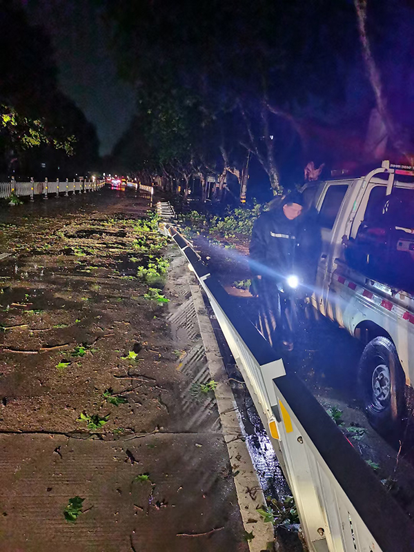浙江衢州安邦施救有限公司接到衢州交警支队指令后,交通设施维护队员立即出动,火速赶赴城区受损路段及各个路口,现场清理搬移被狂风刮倒的护栏和警示柱。马不停蹄,刻不容缓,队员们早已浑身湿透,一个路口清障完立即赶赴下一个路段。一直奋战至凌晨三点多,各受损路段及损坏的护栏全部紧急清理完毕,确保行驶道路安全、顺利通车。