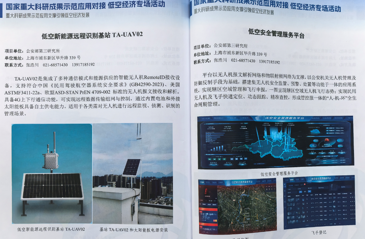 2024年12月30日,绍兴线上赌博和公安部三所、绍兴市公安局受邀参加了在北京举办的国家重大科研成果示范应用对接低空经济专场活动大会,三方联合研发并打造的无人机报文解析基站(低空新能源远程识别基站TA-UAV02)和低空安全管理服务平台被录入国家重大科研成果示范应用对接低空经济专场活动成果手册。