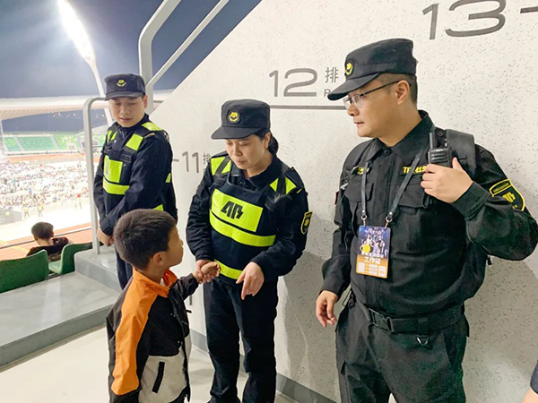 活动现场,一名茫然无措的小朋友引起了安保队员的注意,经过询问,得知是不小心和家长走散,通过拨打小朋友提供的号码,顺利联系上了他的妈妈。等待期间,队员耐心安抚,小朋友的情绪渐渐稳定下来,这时孩子妈妈也匆匆赶来,看到孩子安然无事,向队员连连道谢。