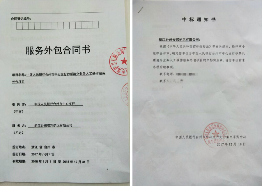 【喜讯】公司成功中标中国人民银行台州市中心支行钞票处理清分业务人工操作服务外包项目