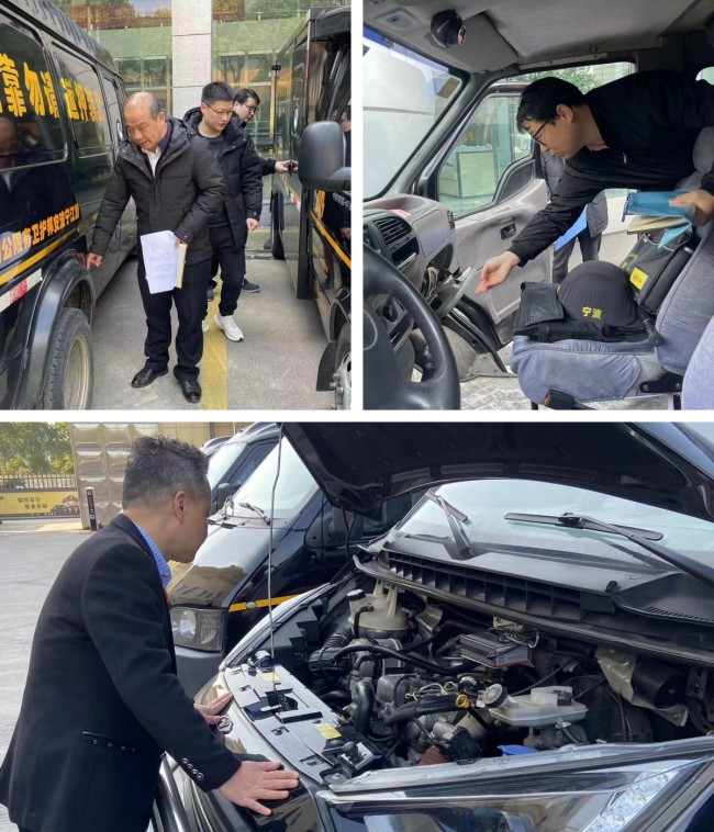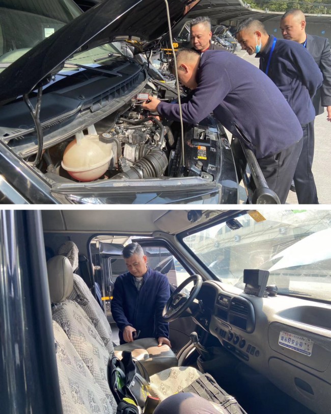 党委副书记、纪委书记李明带队对第一轮检查出的座椅套破损、车身掉漆、标识标线及反光条脱落、发动机油污等问题的整改情况,进行“回头看”安全检查。