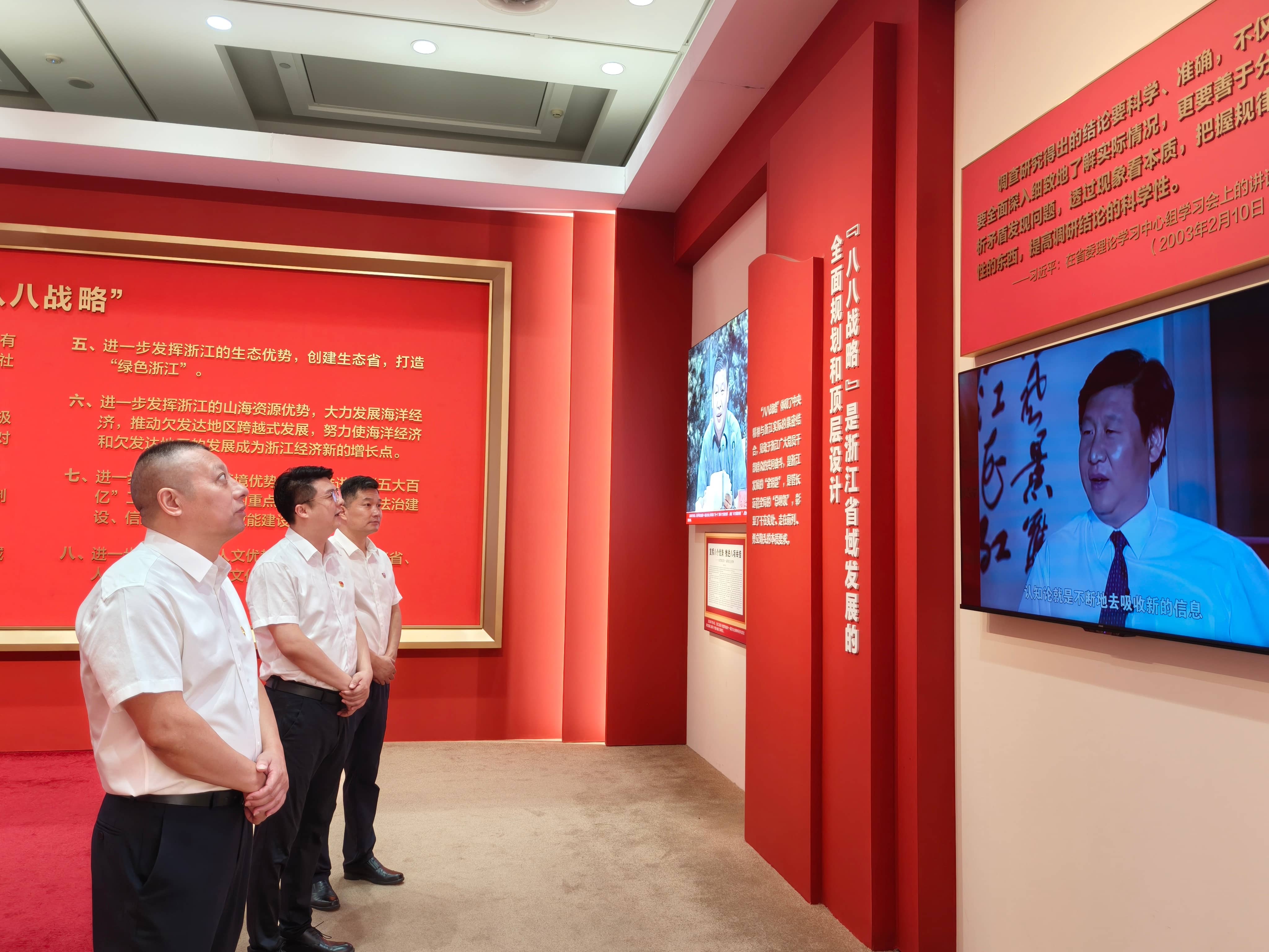 在浙江省展览馆,党员们参观了“大道之行——‘八八战略’实施20周年大型主题展览”,循迹溯源,重温习近平总书记为浙江发展所绘制的宏伟蓝图。展览通过丰富的图文资料、珍贵实物、沉浸式影像,全景展示了浙江在“八八战略”指引下20年来取得的历史性成就和显著变化。从“创新驱动”到“绿色发展”,从“民生福祉”到“党建统领”,党员们边走边看,深刻体悟“八八战略”的前瞻性、科学性和实践性。在“党建统领”展区,大家重温习近平总书记关于全面从严治党的重要论述,进一步坚定了抓党建就是抓发展、抓发展必须抓党建的政治自觉。