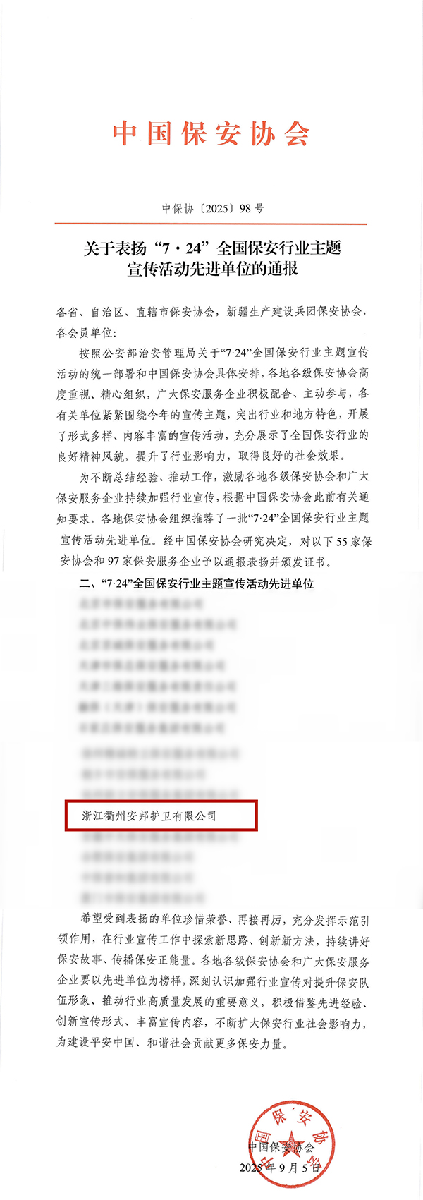 近日,中国保安协会发布《关于表扬“7·24”全国保安行业主题宣传活动先进单位的通报》,通报表扬全国55家保安协会和97家保安服务企业,浙江衢州线上赌博有限公司榜上有名。