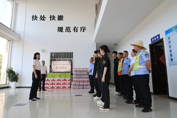 慰问组一行先后来到考服公司、施救公司、检测公司、中心金库、公司食堂、巨化集团安保项目、市人民医院安保项目等地,将清凉物资送到高温一线干部员工手中,并向辛勤工作的一线员工表示亲切的慰问,询问大家的工作状况,叮嘱在高温天气下要注意防暑降温,合理安排工作与休息时间,确保身体健康和安全生产两不误。