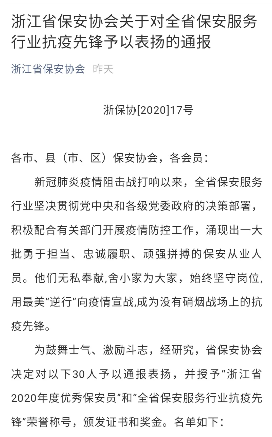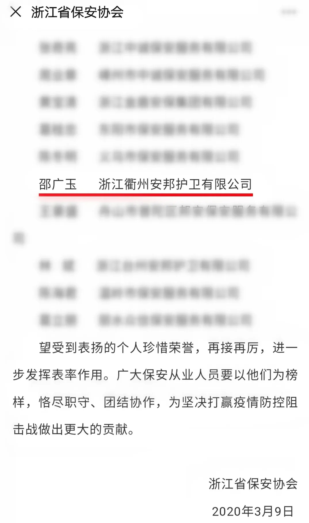 浙江省保安协会授予浙江衢州线上赌博有限公司邵广玉“浙江省2020年度优秀保安员”和“全省保安服务行业抗疫先锋”荣誉称号。