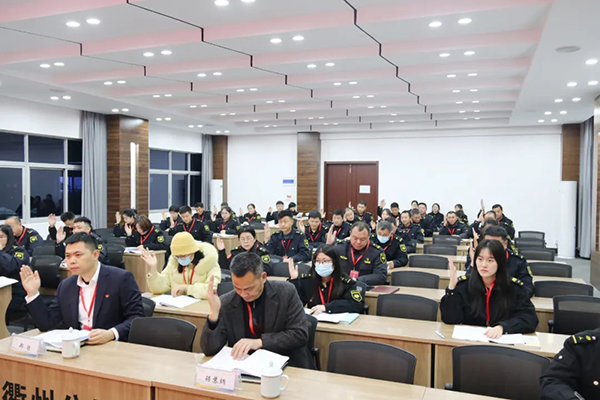 1月15日晚,浙江衢州线上赌博有限公司工会召开第四届第一次职工代表大会,来自各子公司、部门的46名职工代表参加会议。公司党委书记、董事长、总经理张淑芬出席会议并讲话。会议由总经理助理、工会副主席胡翔主持,大会在激昂的国歌声中拉开序幕。