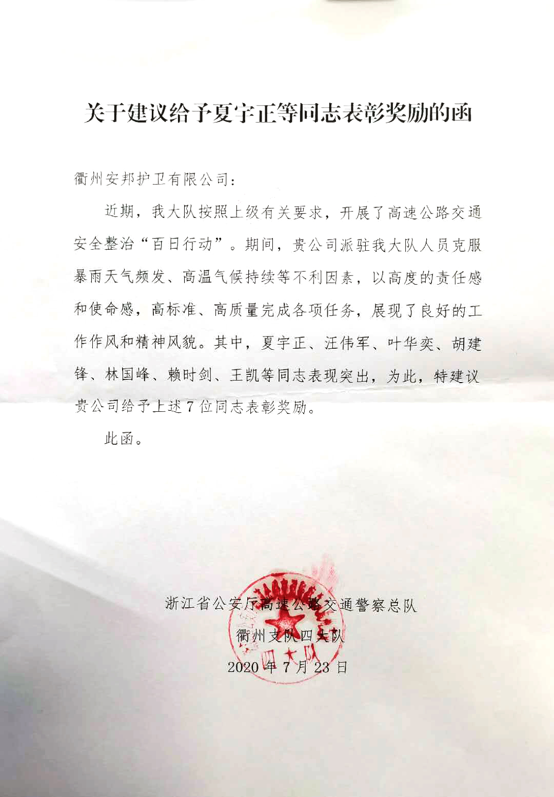 近日,浙江衢州安邦保安服务有限公司收到一份肯定。安邦公司派驻的高速公路交通协管员夏宇正、汪伟军、叶华奕、胡建锋、林国锋、赖时剑、王凯等同志,在高速公路交通安全整治“百日行动”中克服暴雨天气频发、高温气候持续等不利因素,以高度的责任感和使命感,高标准、高质量完成各项任务,展现了良好的工作作风和精神风貌。表现突出,特此提出表扬。