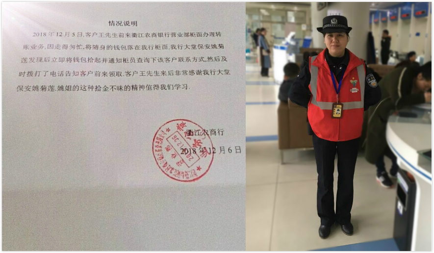 拾金不昧,是一种传统美德,是一个人高尚道德情操的体现。近日,浙江衢州安邦保安服务有限公司派驻衢江农商行队员姚菊莲,执勤时在银行柜面拾到一只皮夹,内有现金四千多元。姚菊莲立即将钱包交给营业厅柜员,寻找失主。失主王先生对姚菊莲表示感谢,农商行领导也对安邦队员赞不绝口,给予了很高的评价。
