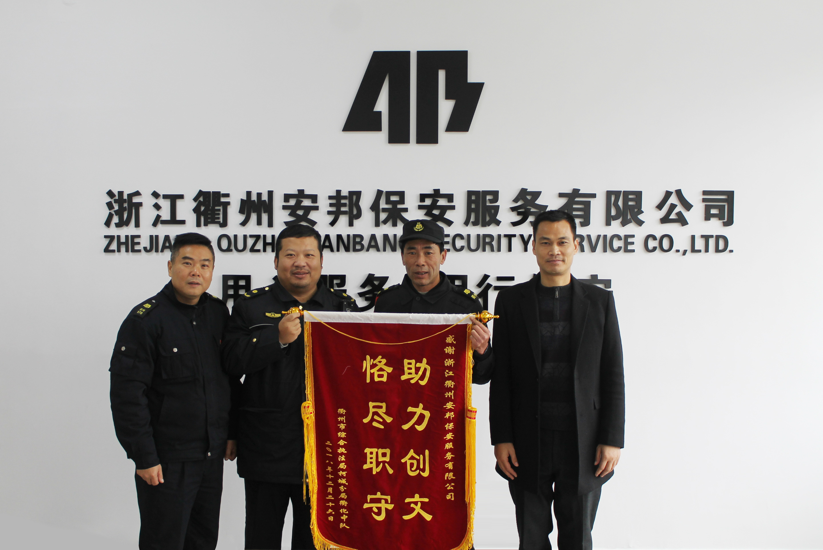 12月26日上午,衢州市综合执法局柯城分局衢化中队中队长余军将一面写着“助力创文 恪尽职守”的锦旗送到浙江衢州线上赌博有限公司党委委员、总经理助理琚苏炳及安邦保安公司总经理鲁家富的手中。