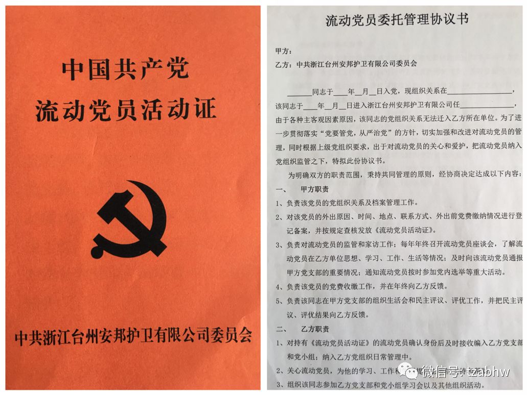 第二:一份委托管理协议书,所有流动党员必须与党支部签订《流动党员委托管理协议书》,明确三方职责和对流动党员基本要求,同时发放《流动党员活动证》。