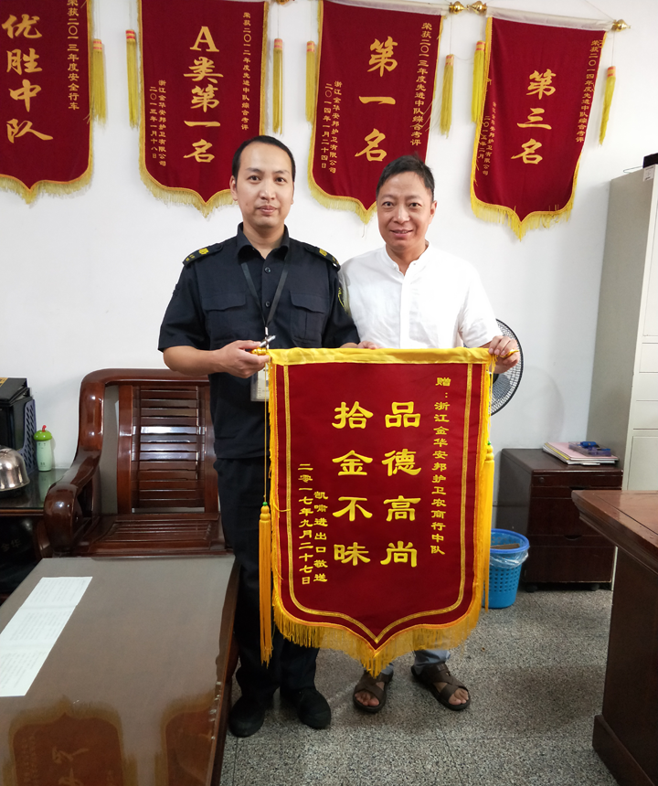 “非常感谢,谢谢。”10月9日上午,义乌凯啸进出口公司赵先生将“品德高尚、拾金不昧”的锦旗送到金华安邦义乌守押大队农商行中队办公室,嘴里还不停地说着感激的话,感谢该中队车长应伟忠将遗失的手机物归原主。(因应伟忠执行任务,由另一名车长代替接旗)