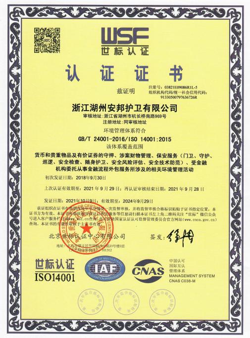 自2018年起,公司对货币和贵重物品及有价证券的守押、涉案财物管理、保安服务(门卫、守护、巡逻、安全检查、随身护卫、安全风险评估、安全技术防范)、受金融机构委托从事金融流程外包服务所涉及的相关环境管理活动进行了环境管理体系认证,并每年通过年审获得相关证书。